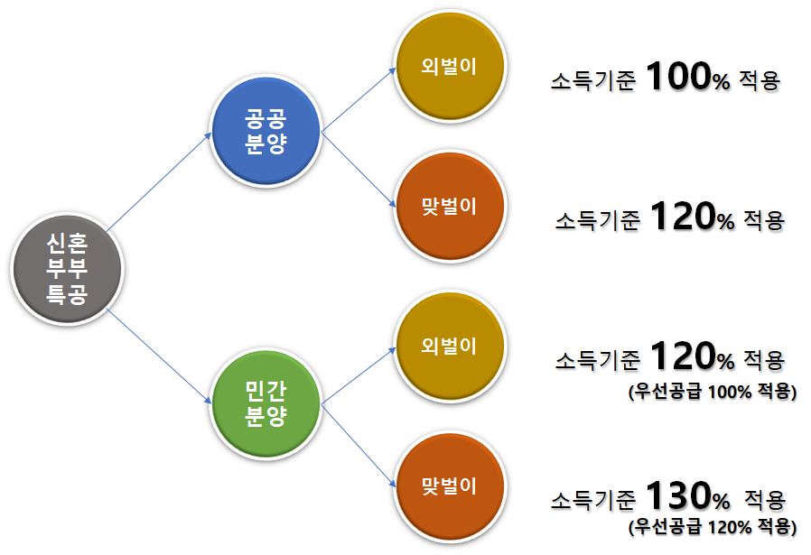 하지만 맞벌이인 경우에 한사람이 공공분양, 우선공급은 100% 이상의 소득을 차지한다면(일반공급은 120%) 신혼부부 특별공급에 지원하지 못합니다. 이점을 꼭 유의해 주세요!